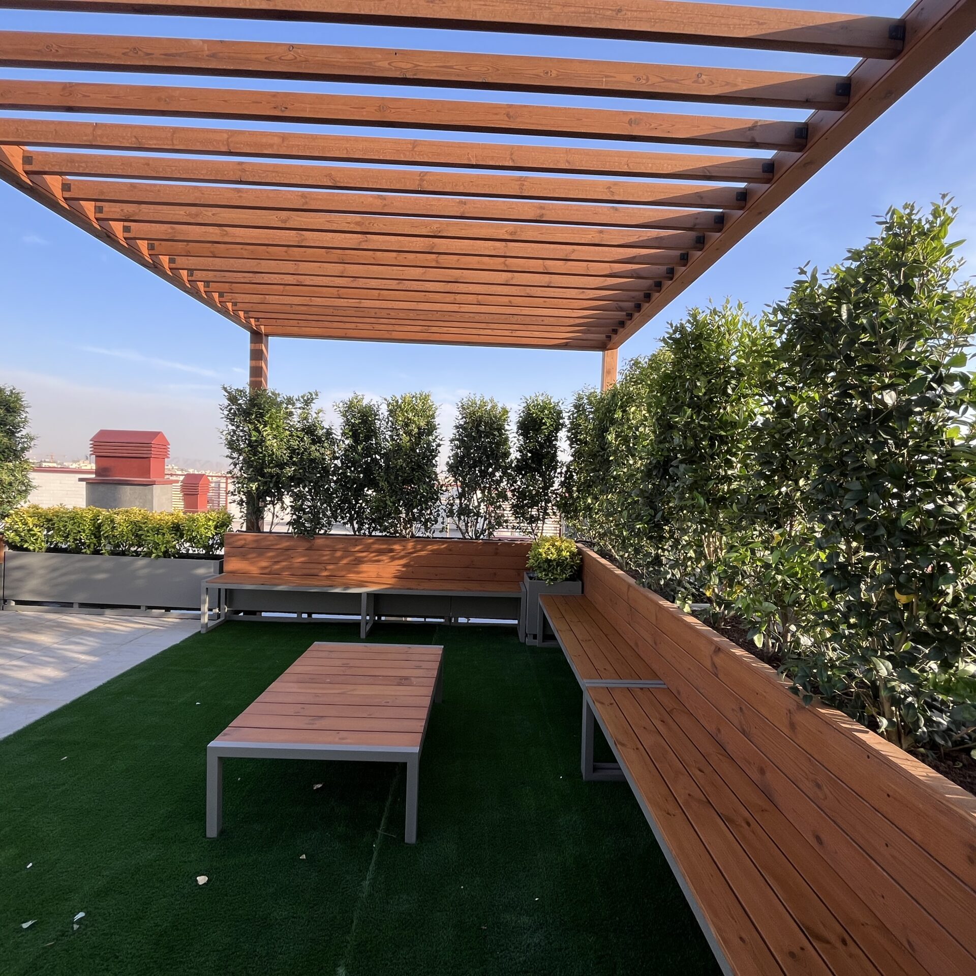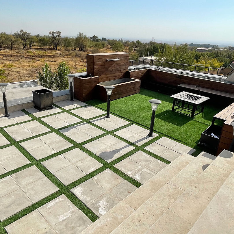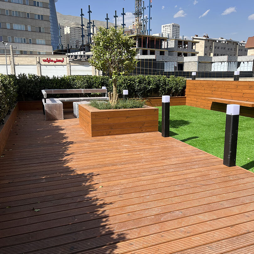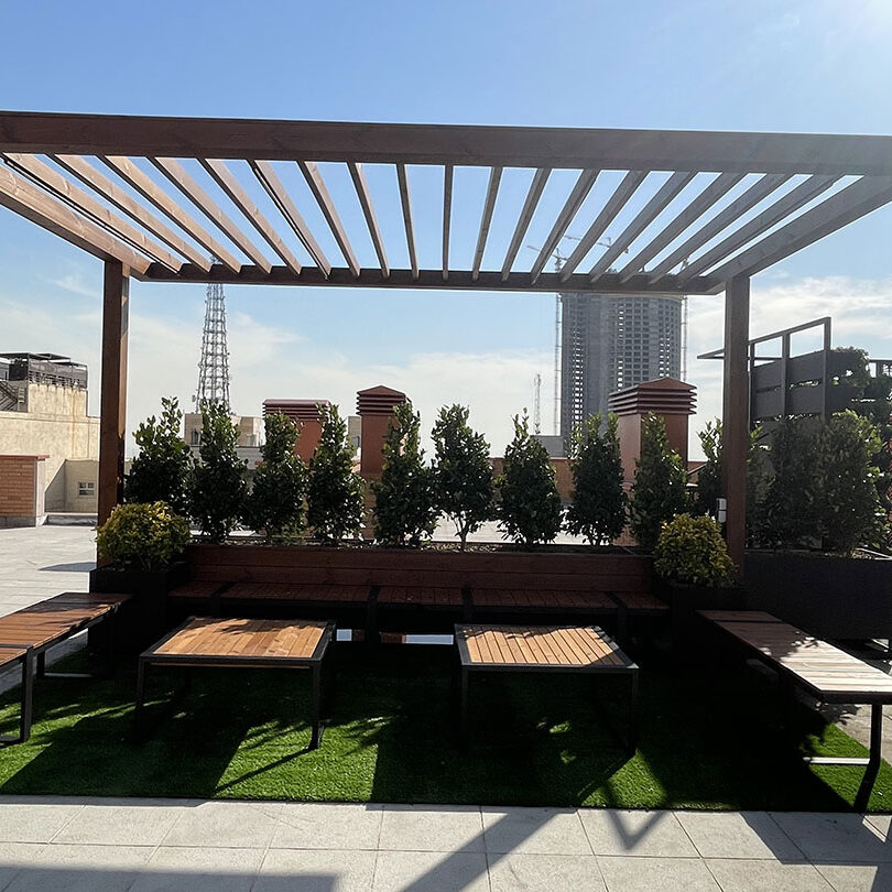 اجرای این پروژه روف گاردن ترکیبی از ترمووود، بتن اکسپوز و فلز بوده و المان های زیادی در آن به کار رفته است .فلاورباکس های استفاده شده از ترمووود بوده و جداره داخلی آن با ورق های گالوانیزه کاور شده و امکان کاشت مستقیم گیاهان فراهم شده است، سیستم زهکشی و خروجی آب های زائد همراه با فیلتر خاک در تمام باکس ها رعایت شده و آبیاری گیاهان با سیستم آبیاری قطره ای صورت می گیرد . در بخشی از فضا دیوار سبز کار شده که شامل باکس های گالوانیزه همراه با فیلتر خاک بوده و هر باکس به صورت کاملا مجزا زهکشی شده تا در صورت بیمار شدن برخی گیاهان، بیماری بوسیله آب به دیگر گیاهان منتقل نشود. پوشش گیاهی دیوار سبز، میخک هندی، هدرا و امین الدوله می باشد . یک آبنما با ترکیبی از استیل و ترمووود بصورت پلکانی تعبیه شده تا صدای آب همواره در فضا در جریان باشد، و با  پوششی از خیزران دیوار پشت آبنما سبز شده است .دو فضا جهت فضاهای نشیمن در دو نقطه درنظر گرفته شده است و بخشی از فضا با سقف متحرک بسته شده تا در زمان بارندگی نیز به راحتی قابل استفاده باشد، برای زیبایی کار زیر سقف متحرک با لوورهای ترمووود پوشیده شده تا همواره فضای نیمه سایه ای را ایجاد کند .